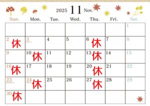 11月3日(月)文化の日 通常通り営業いたします。 11月23日(日)勤労感謝の日 通常通り営業いたします。